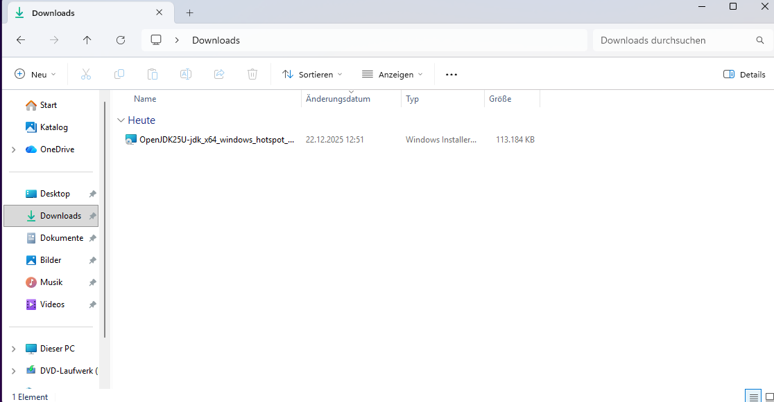 Wenn alles passt, erscheint eine Ausgabe mit „openjdk 25…“ bzw. „Temurin“. Damit ist die Windows-Installation erfolgreich abgeschlossen.