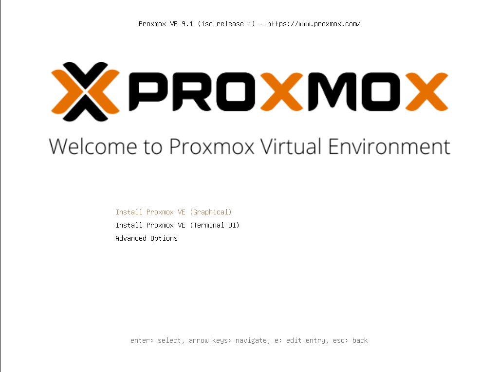 Starte den Server von dem erstellten Installationsmedium. Wähle im Boot-Menü den Punkt „Install Proxmox VE (Graphical)“ aus, um die grafische Installation zu starten.