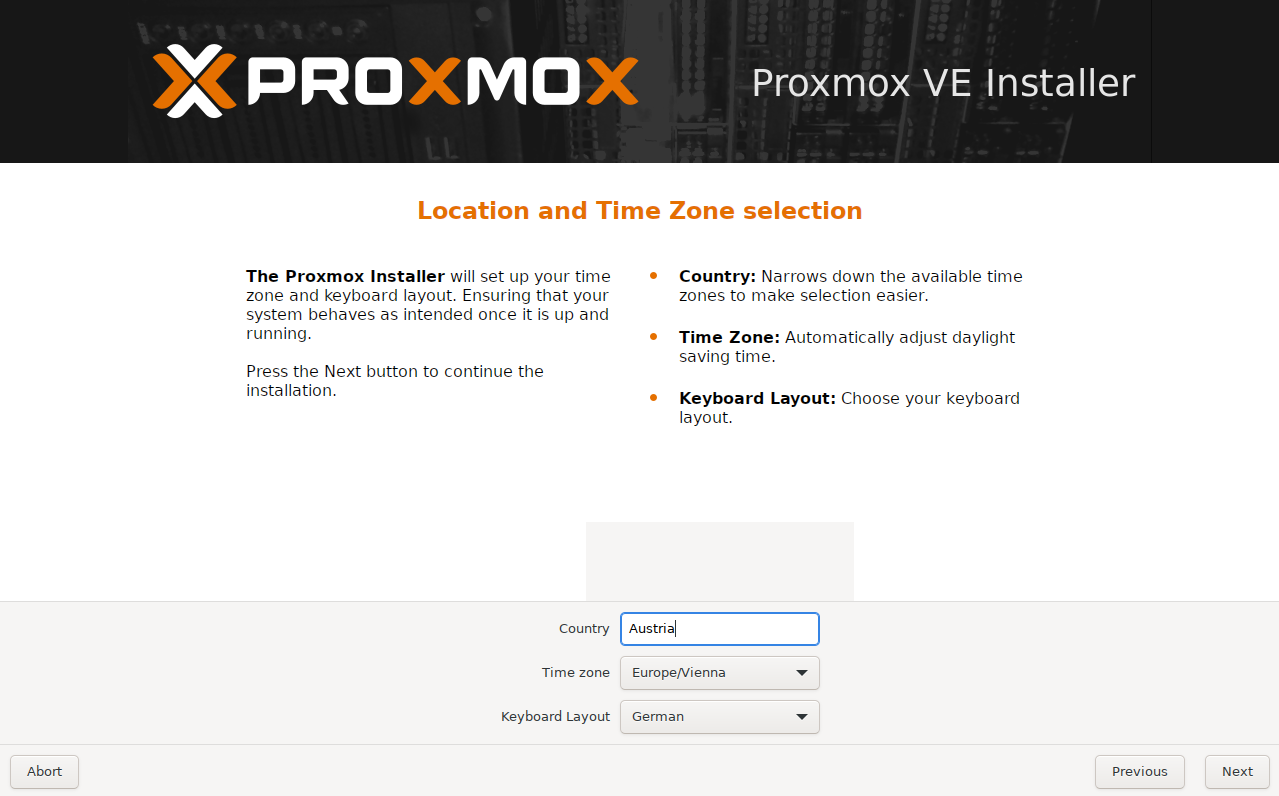 Wähle dein Land, die entsprechende Zeitzone und das gewünschte Tastaturlayout aus.