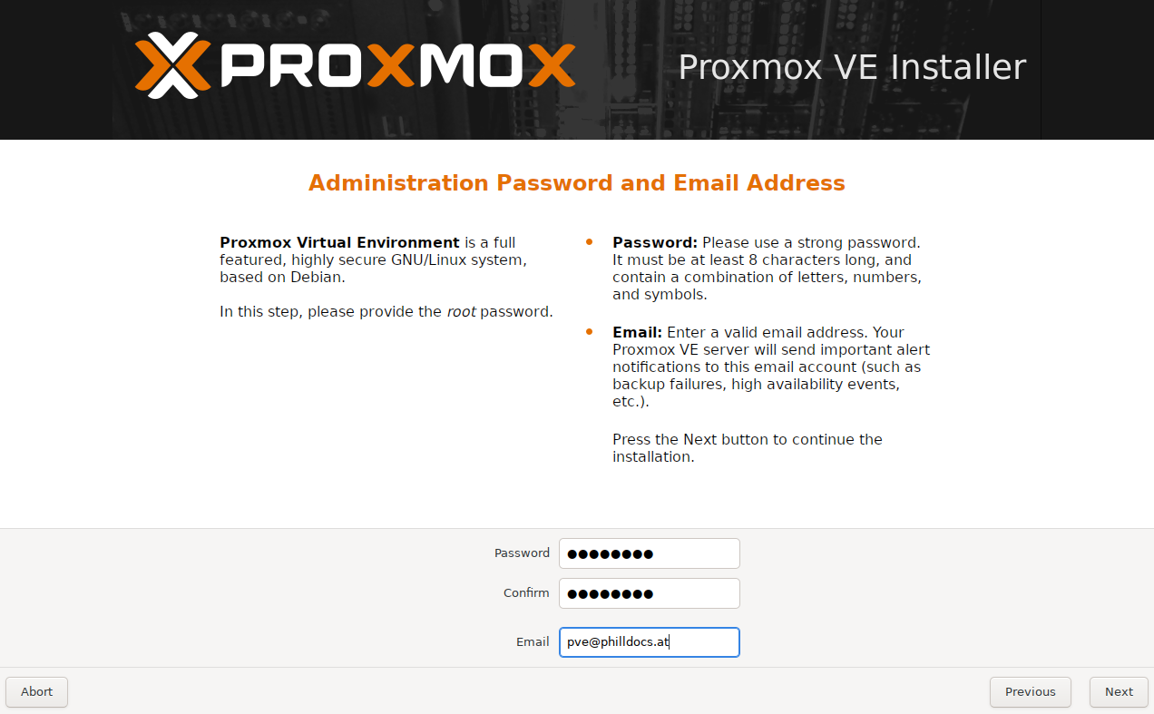 Lege ein sicheres Administrator-Passwort für den Benutzer root fest und gib eine gültige E-Mail-Adresse für Systembenachrichtigungen an.