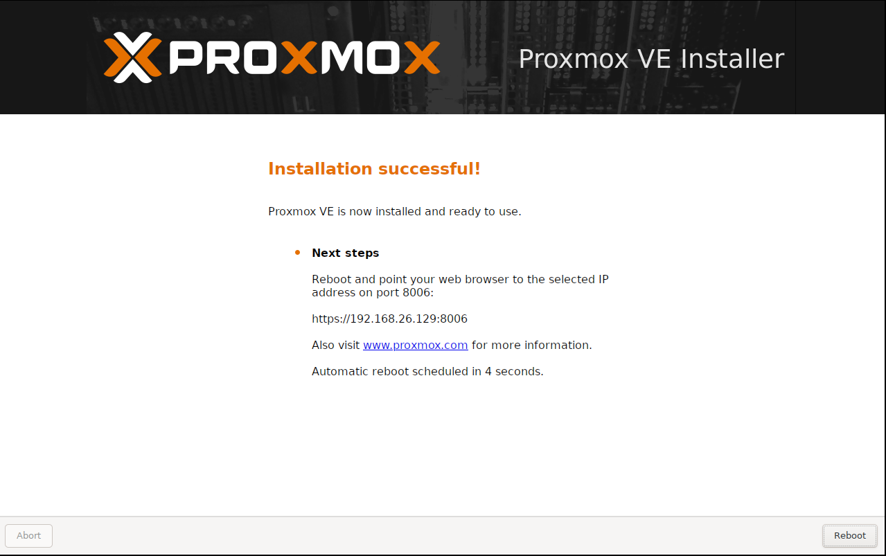 Sobald das System neu gestartet ist, wird in der Konsole die URL angezeigt (z. B. https://192.168.x.x:8006), unter der du die Weboberfläche von Proxmox im Browser aufrufen kannst.